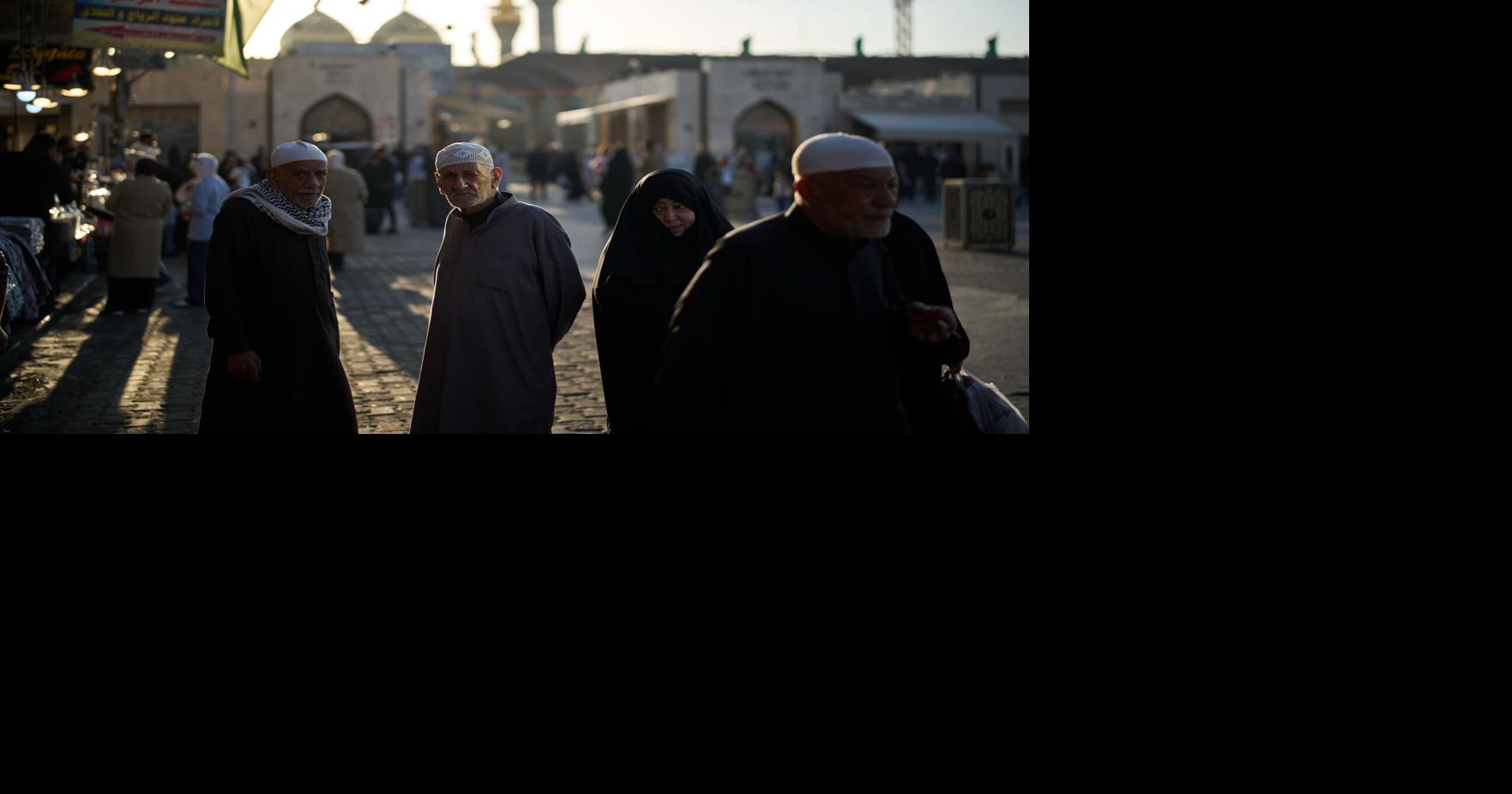 Elderly Muslim men stand at a market near the Kadhimiya Shrine at dusk in the Shiite neighbourhood of Baghdad, Iraq, Tuesday, March 31, 2026. (AP Photo/Leo Correa)