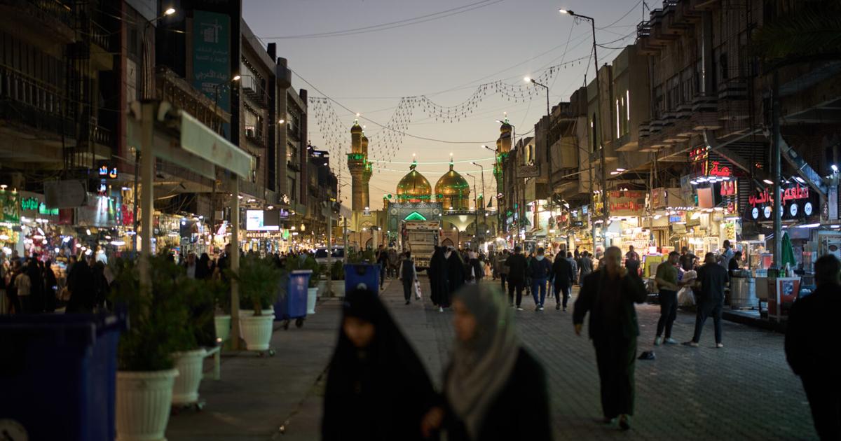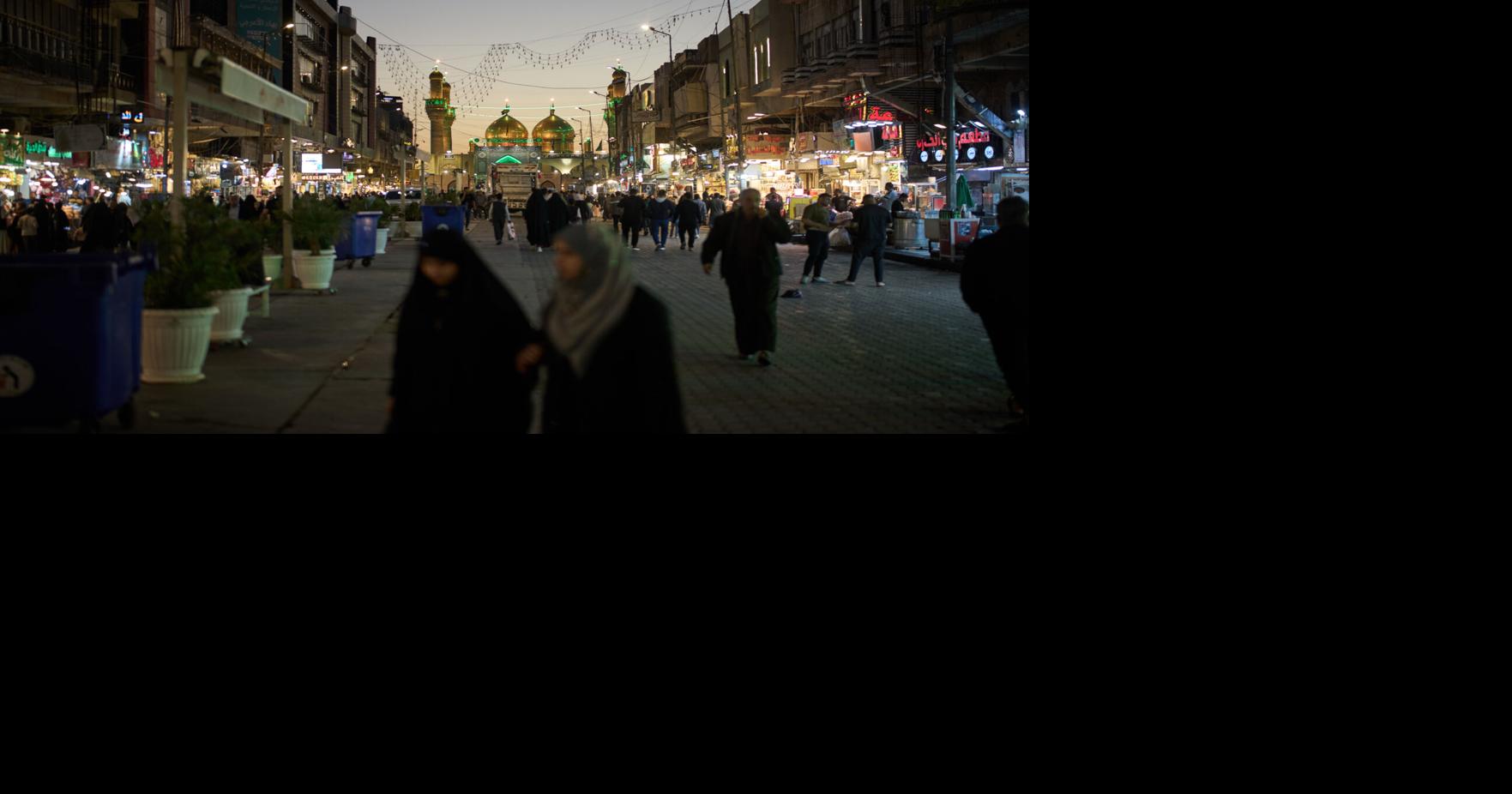 People walk at a local market near the Kadhimiya Shrine at dusk in the Shiite neighbourhood in Baghdad, Iraq, Tuesday, March 31, 2026. (AP Photo/Leo Correa)