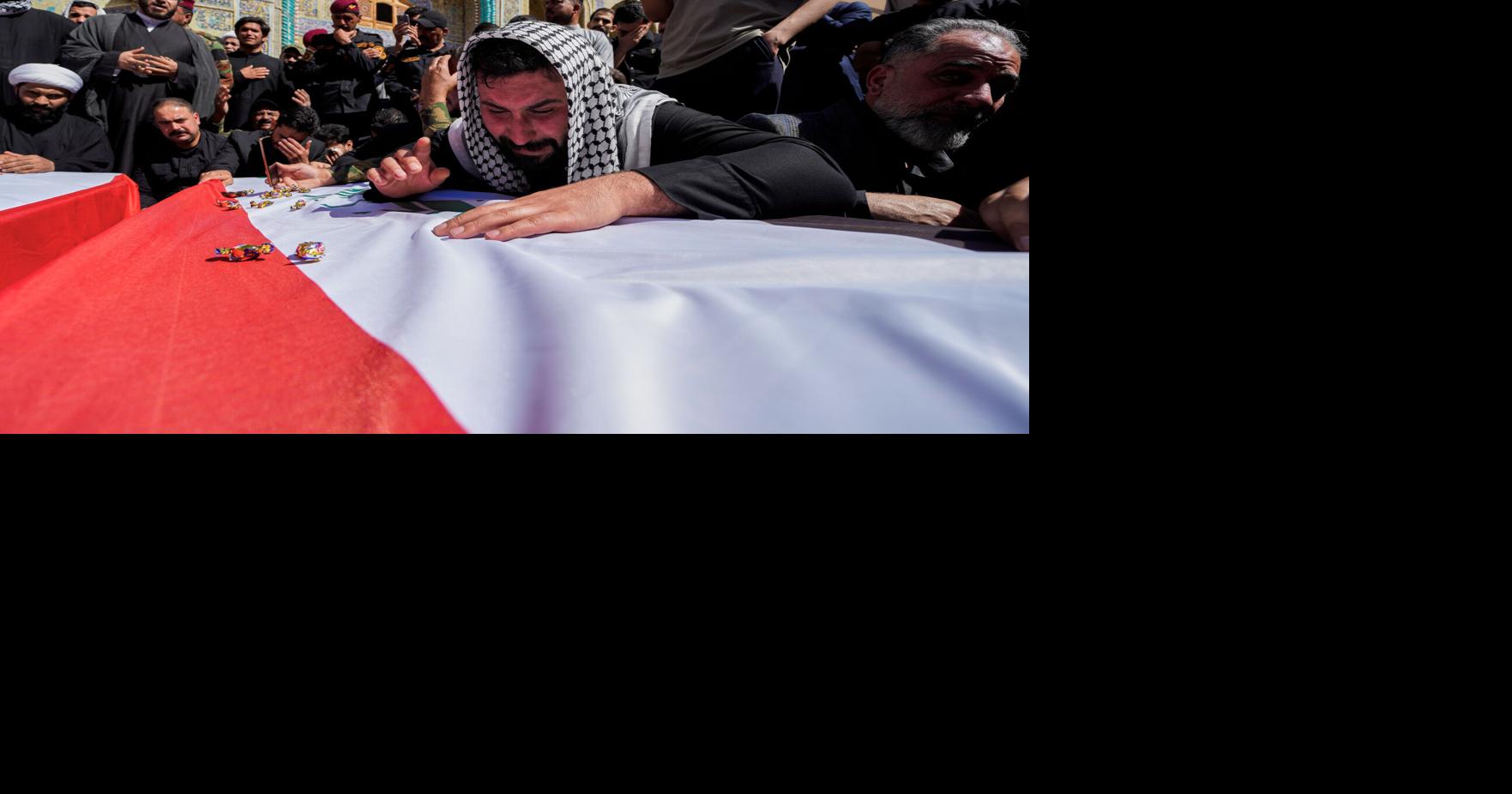 Relatives react during a funeral of a Popular Mobilization Forces fighter who were killed in a U.S. airstrike in Anbar, in Najaf, Iraq, Wednesday, April 1 2026. (AP Photo/Anmar Khalil)