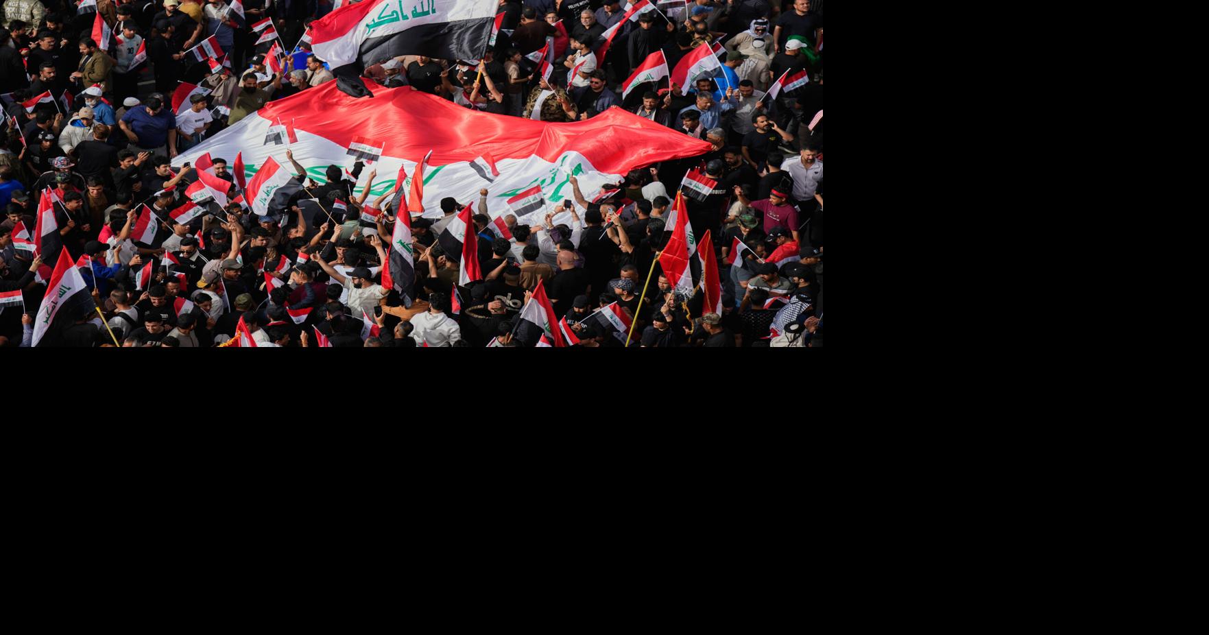 Followers of Iraq’s Shiite cleric Muqtada al-Sadr chant slogans as they wave national Iraqi flag during a protest against U.S. and Israeli attacks on multiple cities across Iran, in Tahrir